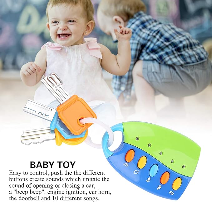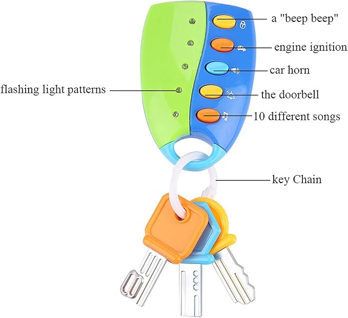 - Colorful and Lifelike Key Toys : Fake car key toys can play 4 car sounds and 10 different songs when pressing different buttons, and flash lights at the same time; The toy keys are colorful and bright, and can also be used as rattles, which is novel to curious small family members